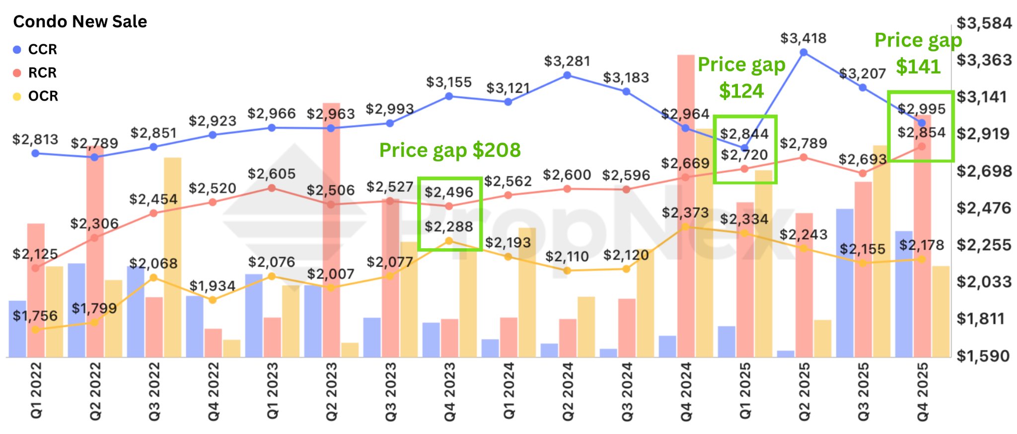 In fact, in 2023, OCR and RCR prices reached a point where they were only $208 psf of each other, though OCR prices have moderated in the past year. On the other hand, the gap between RCR and CCR are closing in, even reaching $124 and $141 psf this year.